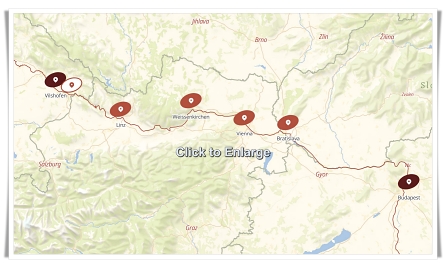 Germany; Linz, Austria; Weissenkirchen, Austria; Vienna, Austria; Bratislava, Slovakia; and ending in Budapest, Hungary. The closest airport to Vilshofen, Germany is Linz, Austria 76 miles away. The Salzburg, Austria airport is 90 miles from Vilshofen, and the Munich, Germany airport is 92 miles from Vilshofen. Click