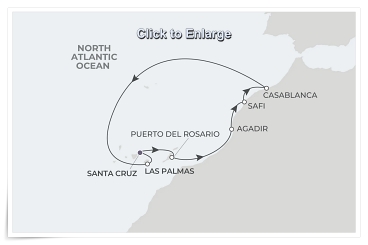Sail through the spellbinding contrasts of the Atlantic on a voyage that blends the wild volcanic beauty of the Canary Islands with the rich cultural textures of coastal Morocco. From the golden shores of Puerto del Rosario and the cloud-wreathed heights of Tenerife’s Mount Teide to the bustling souks of Agadir and the grandeur of Casablanca’s Hassan II Mosque, each stop reveals a new world of wonder. Taste wines born of lava fields, explore hillside medinas, and uncover the layered histories of these storied ports. This is a journey where natural marvels and timeless traditions meet beneath the Atlantic sun.